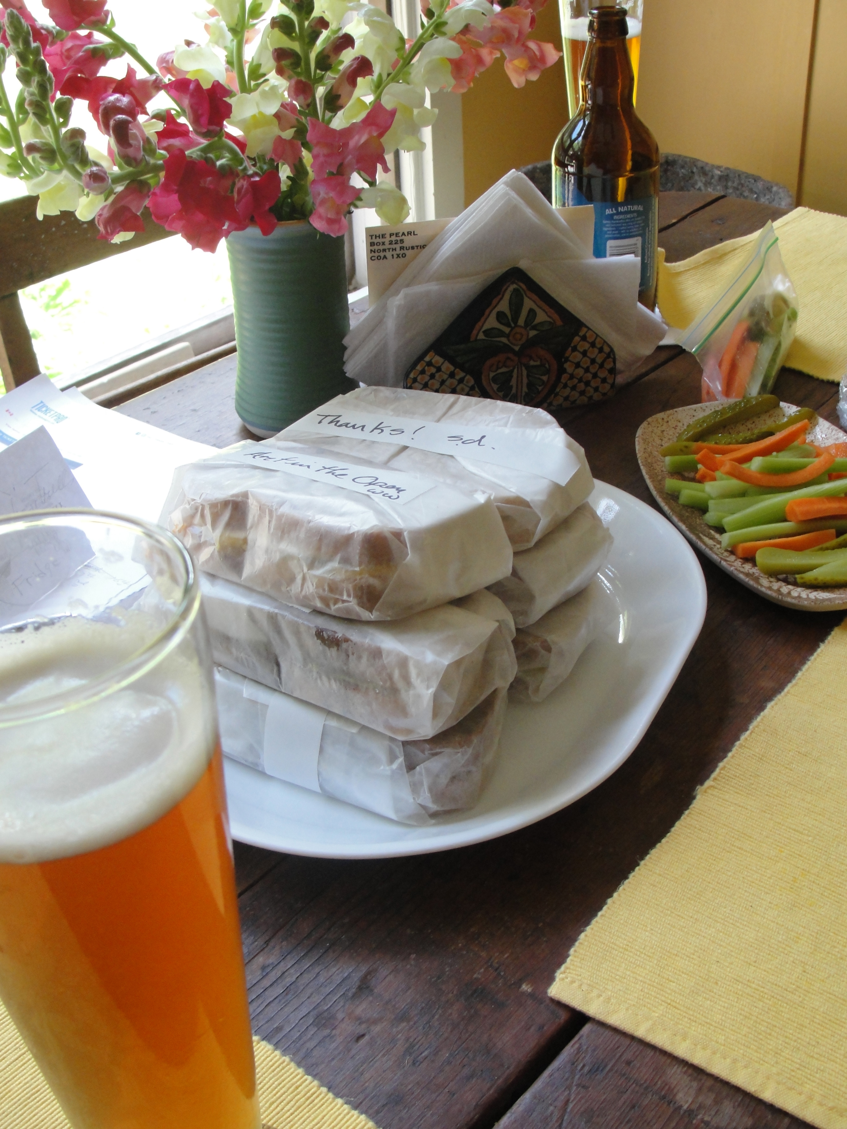 The sandwich artist dropped by her parents’ place recently. They supplied the beer and she supplied the sandwiches. And, it would seem we have a winner! Once we confirm with suppliers we will let you know a little more about Art in the Open‘s official sandwich of 2015.